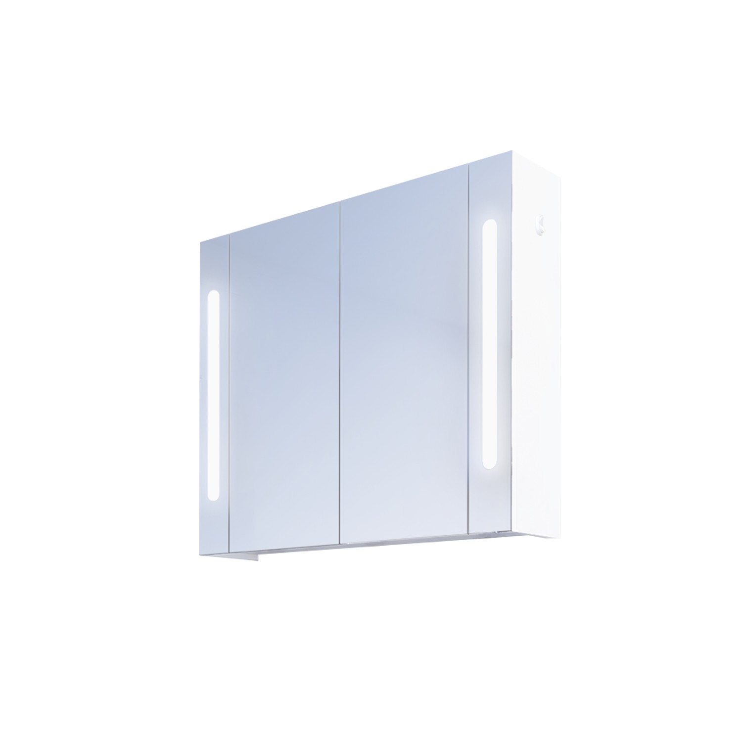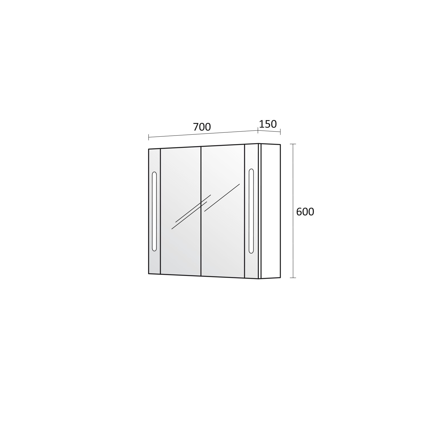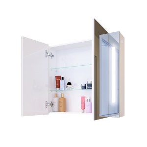 Допълнителна информация Практичен горен шкаф за баня с LED осветление. Две врати с огледало и два стъклени рафта, които функционално разпределят пространството за козметика и тоалетни принадлежности. Горен шкаф PVC Два стъклени рафта Две врати Плавно затваряне Панти хром-никел LED вградено осветление Вградено ел.ключе за осветление Захранване 220V Неутрална светлина 4000-4200К Размери в мм: Ш – 700 / В – 600 / Д – 150 Материал PVC водоустойчив Размери над 65 см. Назад