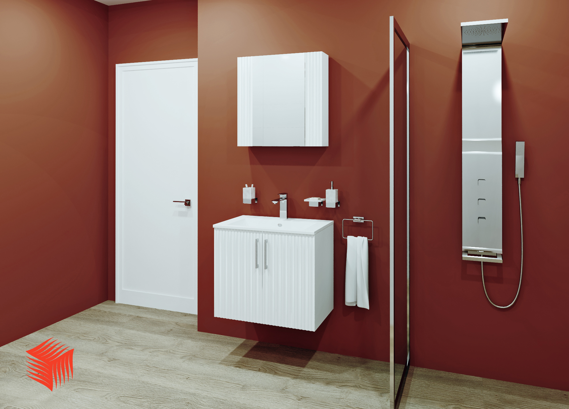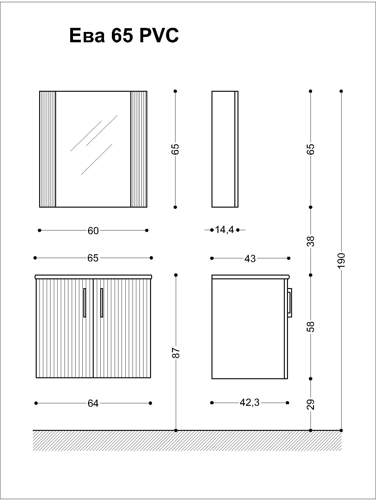 Допълнителна информация Комплект мебели за баня с бяло гланцово покритие, изработени от водоустойчиво PVC с дебелина 18 мм. Горният шкаф е с размери ш.60 д.14,4 в.65см, има една огледална врата и един подвижен стъклен рафт. Долният шкаф е окачен, с размери ш.65 д.43 в.58см, и две врати. Порцеланова мивка. В цената не е включен смесител. Материалът PVC от който изработваме нашите мебели е с плътност 0,55 и дебелина 15мм и 18мм. Посочениете цени са с включено ДДС. артикул цена цена Горен шкаф 348.00 лв. 177.93 лв. Долен шкаф с мивка 579.00 лв. 296.04 лв. Материал PVC водоустойчив Размер от 55 см. до 65 см. Назад