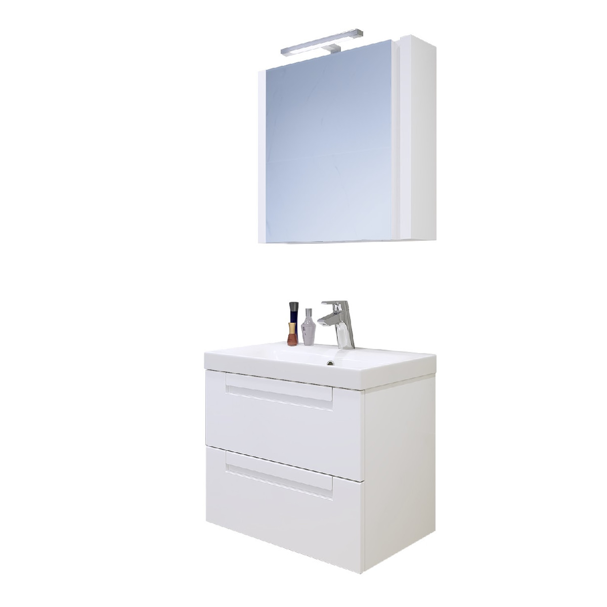 Допълнителна информация Горен шкаф Изработен от 100% водоустойчиво PVC Плавно затваряне Панти хром-никел LED осветление Захранване 220V Неутрална светлина 4000-4200К Една врата Два стъклени рафта Размери в мм: Ш – 600 / В – 650 / Д – 150 Долен шкаф Изработен от 100% водоустойчиво PVC Порцеланова мивка Moduo Slim 60 Две чекмеджета Плавно затваряне Включени крепежни елементи Размери в мм: Ш – 600 / В – 550 / Д – 380 Материал PVC водоустойчив Материал PVC водоустойчив Материал PVC водоустойчив Размери от 55 см. до 65 см. Размери от 55 см. до 65 см. Размер от 55 см. до 65 см. Назад