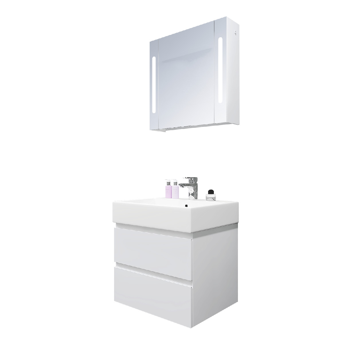 Допълнителна информация Горен шкаф Изработен от 100% водоустойчиво PVC Плавно затваряне Панти хром-никел LED вградено осветление Вградено ел.ключе за осветление Захранване 220V Неутрална светлина 4000-4200К Една врата Два стъклени рафта Размери в мм: Ш – 600 / В – 600 / Д – 150 Долен шкаф Изработен от 100% водоустойчиво PVC Порцеланова мивка Esvit 60 Две чекмеджета Плавно затваряне Включени крепежни елементи Размери в мм: Ш – 600 / В – 580 / Д – 420 Материал PVC водоустойчив Размер от 55 см. до 65 см. Назад