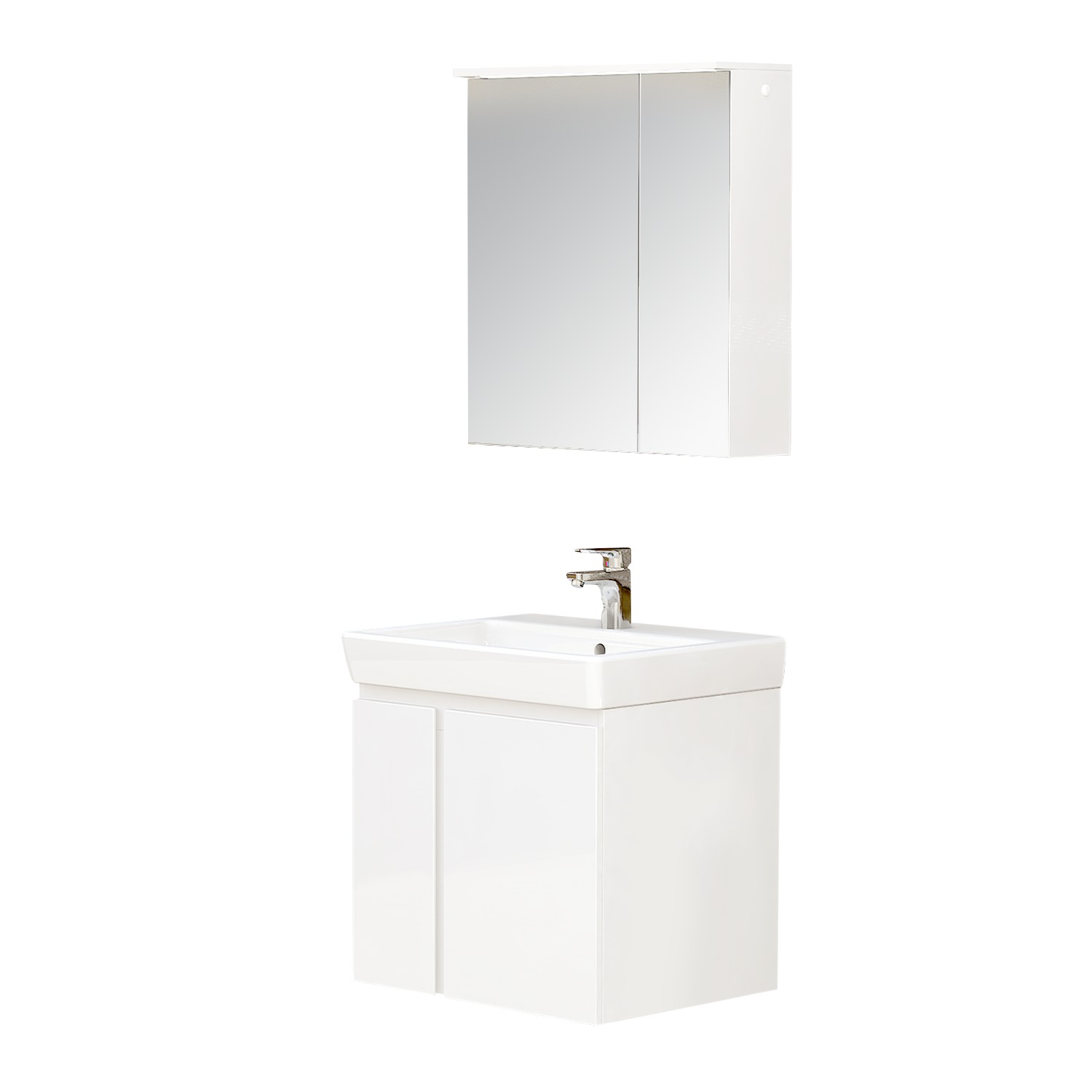Допълнителна информация Горен шкаф PVC Плавно затваряне Панти хром-никел LED вградено осветление Вградено ел.ключе за осветление Захранване 220V Неутрална светлина 4000-4200К Две врати Два стъклени рафта Размери в мм: Ш – 550 / В – 600 / Д – 180 Долен шкаф Изработен от 100% водоустойчиво PVC Порцеланова мивка Roca Две врати Плавно затваряне Панти хром-никел Включени крепежни елементи Размери в мм: Ш – 550 / В – 550 / Д – 450 Материал PVC водоустойчив Размер до 55 см. Назад