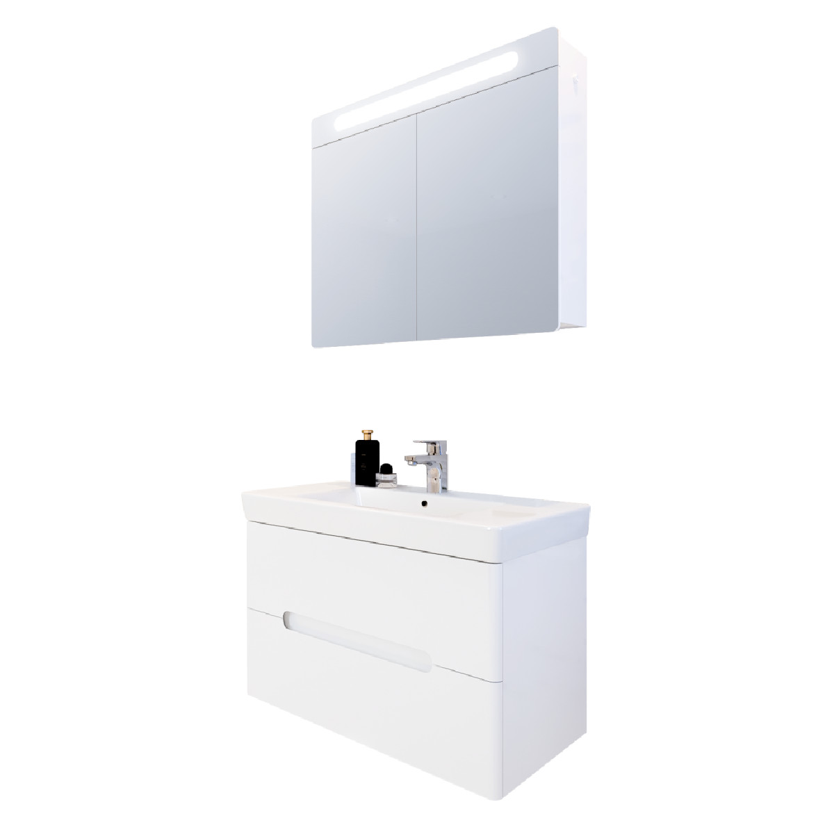 Допълнителна информация Горен шкаф PVC Три стъклени рафта Две врати Плавно затваряне Панти хром-никел LED вградено осветление Вградено ел.ключе за осветление Захранване 220V Неутрална светлина 4000-4200К Размери в мм: Ш – 800 / В – 650 / Д – 150 Долен шкаф Изработен от 100% водоустойчиво PVC Порцеланова мивка Roca Две чекмеджета Плавно затваряне Включени крепежни елементи Размери в мм: Ш – 800 / В – 550 / Д – 450 Материал PVC водоустойчив Размер над 65 см. Назад
