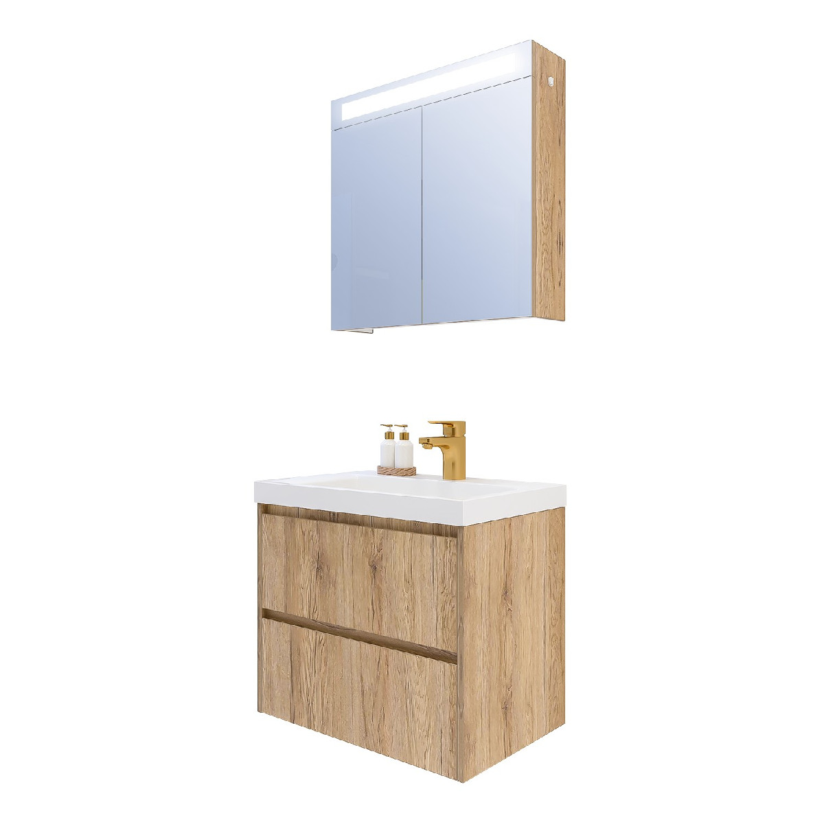 Допълнителна информация Горен шкаф Изработен от 100% водоустойчиво PVC HPL покритие KAINDL 34140 Плавно затваряне Панти хром-никел LED осветление Вградено ел.ключе за осветление Захранване 220V Неутрална светлина 4000-4200К Две врати Стъклен рафт Размери в мм: Ш – 600 / В – 600 / Д – 150 Долен шкаф Изработен от 100% водоустойчиво PVC HPL покритие KAINDL 34140 Порцеланова мивка Moduo Slim 60 Две чекмеджета Плавно затваряне Панти хром-никел Включени крепежни елементи Размери в мм: Ш – 600 / В – 550 / Д – 380 Материал PVC водоустойчив Размер от 55 см. до 65 см. Назад