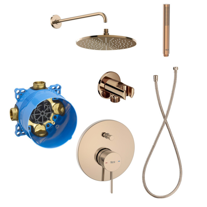 Допълнителна информация Тяло за вграждане RocaBox (A525869403) • Вид монтаж: Вграден • Място за инсталиране: Вана, Душ • Тип глава: Керамична Смесител за вграждане, за вана / душ, розово злато, Ona (A5A0B9ERG0) Душ ръчен Stella, розово злато (A5B9B61RG0) Душ глава 230mm, Rainsense, розово злато (A5B1803RG0) • Душ глава 300mm, предназначена за монтаж със стенно рамо или с рамо за таван • Една функция на струята • Тегло: 1kg Стенно душ рамо 400mm, розово злато (A5B0250RG0) Извод за вода с държач, розово злато (A5B5250RG0) Шлаух за душ 170cm, розово злато (A5B3850RG0) Назад