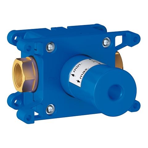 Допълнителна информация За тяло за вграждане За монтаж на Grohtherm Custom Shower Systems Кутия за вграждане със свалящ се предпазен капак Водоустойчива мембрана За мокър или сух монтаж Определени точки за фиксиране на предната и задната стена Тяло от DR-месинг Керамична глава 3/4“ Външна резба ½“ Дебит:, 55 l/min. при 3 bar Дълбочина на монтаж 70 - 95 mm Минимално налягане 1 bar. Вид Тяло за вграждане Назад